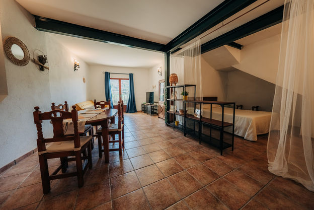 Acogedor apartamento tipo loft, ideal para parejas o escapadas en solitario, donde el confort y el encanto rural se combinan a la perfección. Este espacio diáfano cuenta con una cuidada decoración y todo lo necesario para una estancia relajante en plena naturaleza.
